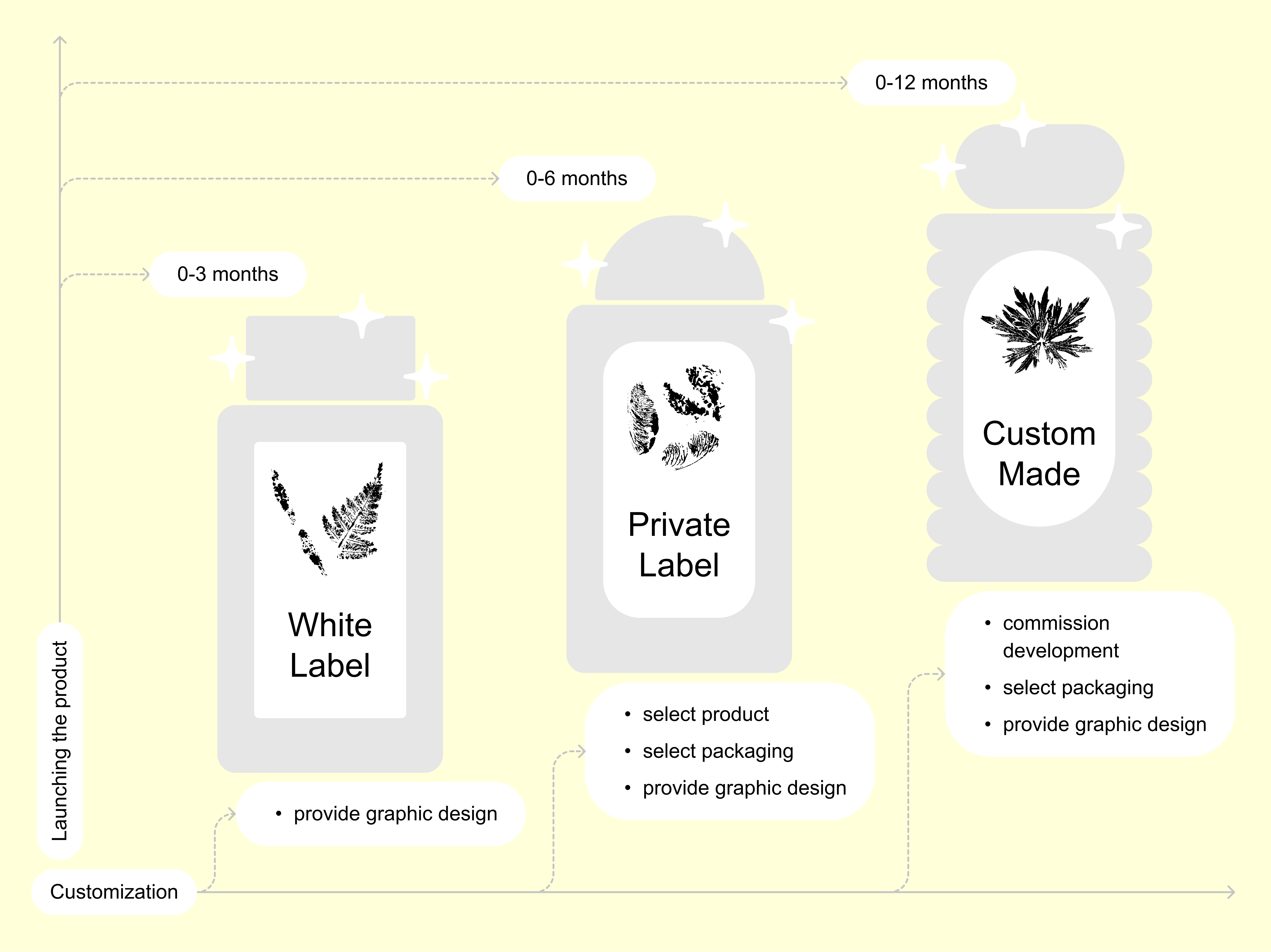 Choose a finished product including packaging from our portfolio, add your own graphic design and start selling.
